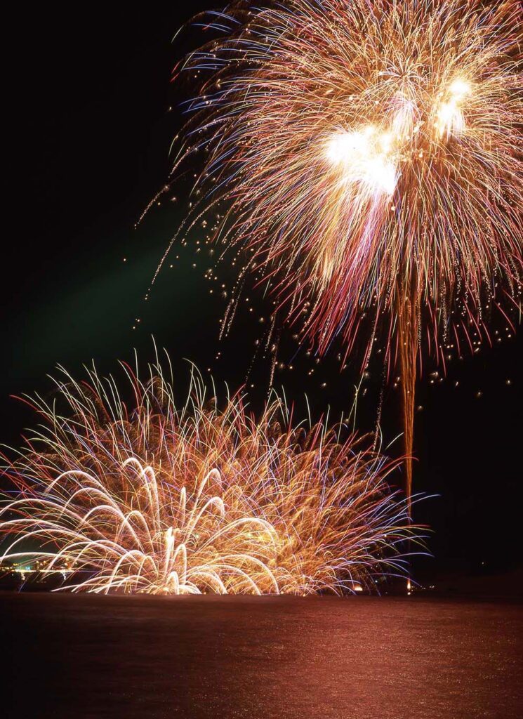 約1,000発の花火が砂浜から打ち上がり、迫力ある光と音を間近で楽しめます。
